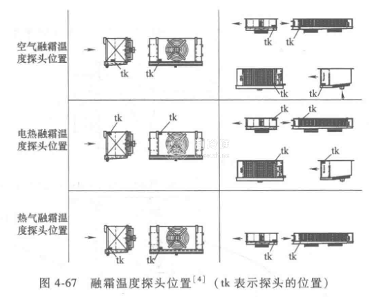 融霜溫度探頭在冷風(fēng)機(jī)蒸發(fā)盤管的位置很重要,它關(guān)系到融霜在什么時(shí)候結(jié)束最合適。融霜過早結(jié)束,蒸發(fā)盤管的箱層沒有完全融化。如果這種情況持續(xù)下去,霜層的累積會(huì)導(dǎo)致最后在蒸發(fā)盤管的翅片上形成大片的冰塊,最終燕發(fā)器無法降溫;如果融箱太遲結(jié)束,會(huì)造成能源的浪費(fèi),而且?guī)鞙厣仙R虼诉@個(gè)融箱溫度探頭應(yīng)該放置在這臺(tái)燕發(fā)器融霜最差的位置,那么什么地方是蒸發(fā)器融霜最差的位置呢?不同的融霜方式其位里是不同的,一般有以下幾種情況(參見圖4-67):