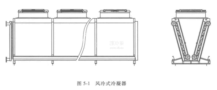 (1)風冷式冷凝器(圖5-1)通過風機把空氣吹在冷凝器盤管翅片上,把制冷劑氣體的凝結熱排到大氣中。這種冷凝器的最新發(fā)展,是在冷凝器盤管翅片的旁邊加裝用于噴水的水管。在制冷系統(tǒng)夏季氣溫高導致冷凝壓力過高的情況下,水管噴嘴便會向冷凝器盤管翅片噴水。換熱盤管的濕潤增加了冷凝器的換熱效率,同時水汽燕發(fā)把盤管內的制冷劑熱量帶走,從而使冷凝壓力明顯降低。