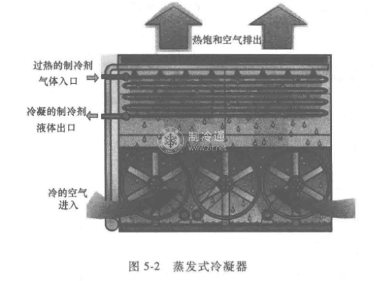 (3)蒸發(fā)式冷凝器(圖5.2)蒸發(fā)式冷凝器是靠水蒸發(fā)帶走熱量。噴淋下來的水一部分蒸發(fā)帶走熱量,未蒸發(fā)的水,被冷凝器中流動的空氣冷卻。因此,蒸發(fā)式冷凝器同時起到冷卻塔的功能。制冷劑在管內凝結,空氣流過時這些管向空氣噴灑水。部分水在空氣中的蒸發(fā)是熱量排向大氣中的主要過程。