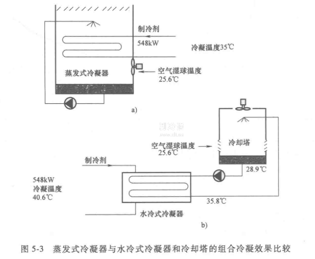 參考文獻曾經把蒸發(fā)式冷凝器,與殼管式冷凝器和冷卻塔相結合的冷卻系統(tǒng)進行對比。結果顯示用相同工況下蒸發(fā)式冷凝器實現(xiàn)冷凝溫度35℃,而水冷式冷凝器冷凝溫度是40.6℃,即采用蒸發(fā)式冷凝器冷凝溫度降低了5.6%,蒸發(fā)式冷凝器的性能優(yōu)越性在于避免中間介質(冷卻塔水)傳熱過程。使用冷卻塔時出水的溫度是28.9℃,而進水的溫度只能接近環(huán)境濕球溫度,即進水溫度35. 8℃(圖5-3a與圖5-3b),蒸發(fā)式冷凝器的傳熱效果可以使冷凝溫度更接近空氣的濕球溫度。從資金成本來說,蒸發(fā)式冷凝器的成本可能小于水冷式冷凝器、冷卻塔的造價總和。