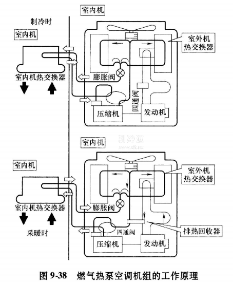 燃氣熱泵空調機組是以嫌氣發動機來驅動壓縮機,使制冷劑循環反復進行物理變化,完成熱量的不斷交換傳遞,并通過四通閥的轉換使機組實現制冷和制熱。燃氣熱泵機組增加了發動機及其冷卻水系統,因此機組的尺寸比普通電WK動熱泵稍大。燃氣熱泵空調機組的工作原理圖如圖9-38所示。