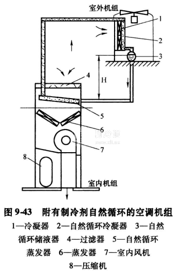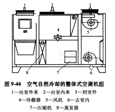 此外機房空調還有一些特殊的型式,圖9-43為附有制冷機自然循環的空調機組的結構示意圖,在空調機組內的壓縮機制冷循環外,再組裝獨立制冷機自然循環回路,借助于主回路的室內、外風機實現在冬季時的無動力自然循環;另一種以節能為主,直接吸進冷空氣對機房進行冷卻的空氣自然冷卻的整體式空調機組如圖9-44所示。