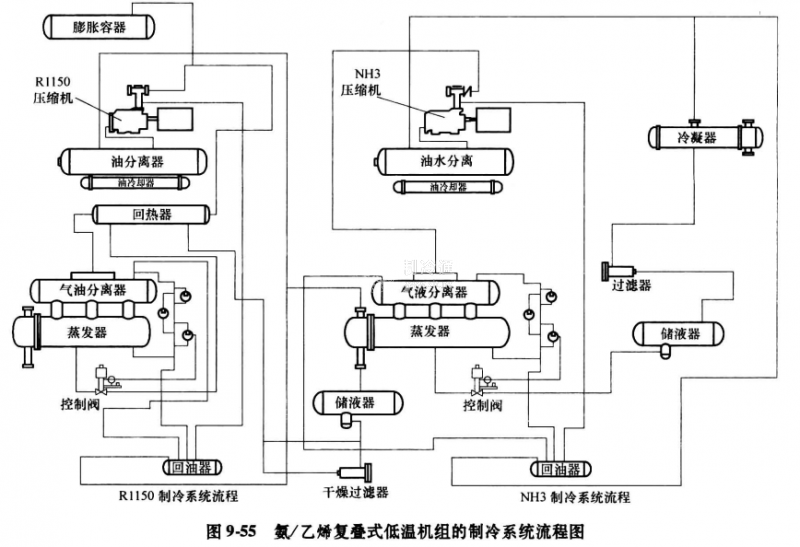 近年來,針對(duì)臭氧層破壞和全球變暖問題,新型氨/乙烯、氨/乙烷復(fù)疊式低溫機(jī)組得以發(fā)展開發(fā),并應(yīng)用于大型的深冷系統(tǒng)中,圖9-55是氨/乙烯復(fù)疊式低溫機(jī)組的制冷系統(tǒng)流程圖。