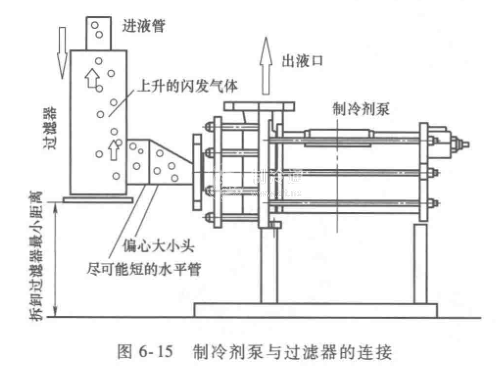 解決這個問題的辦法是在停機時產生的閃發氣體直接通過過濾器上方的直管回到低壓循環桶,只要過濾器和直管的尺寸足夠大,同時還要縮短過濾器和泵的進液口連接的距離(圖6-15),過濾器的出口和制冷劑泵法蘭的連接就只需要一個偏心大小頭。這樣,在這一段產生的閃發氣體由于偏心大小頭的引導就可以通過過濾器和直管回到低壓循環桶,而不是依靠開機時通過制冷劑泵上面的抽氣管。筆者在歐洲參觀冷庫的制冷系統時,發現在氨泵連接上根本就沒有設置抽氣管,氨泵上液時根本不會出現汽蝕現象。