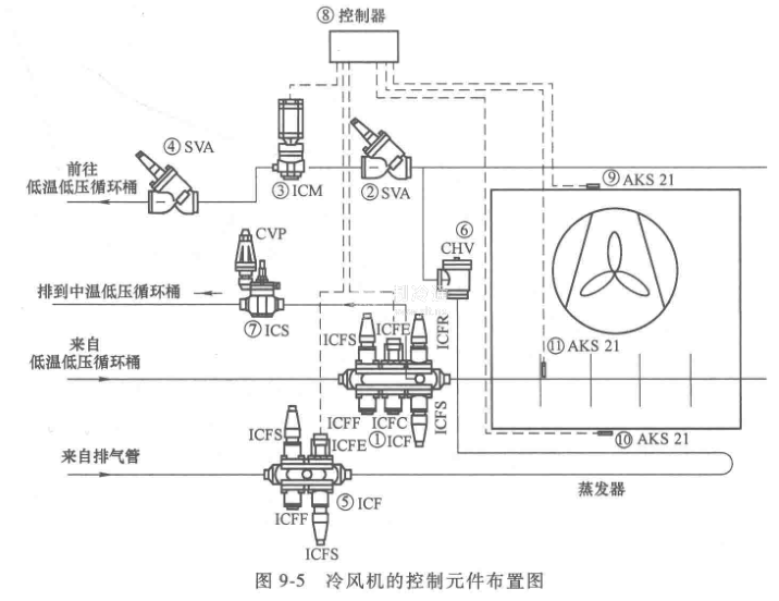 冷風機的控制回路(圖9-5)功能特點是:具有多個溫度控制點,這些溫度控制點除了控制庫房的溫度外(這個點是在庫房溫度達到設置溫度時關(guān)閉供液電磁閥),還用于控制融霜溫度終止值。在達到融霜溫度后,提前終止融霜,以減少能耗;如果還要細化,還可以設置融霜后冷風機風扇重新起動的溫度,這是因為在蒸發(fā)器融霜后,蒸發(fā)器的盤管翅片仍然有熱量,如果這時起動冷風機的風扇,這些熱量會加熱庫房的空氣溫度.導致庫房的空氣膨脹,若情況嚴重會把冷庫的門頂開,如果這道門鎖上,會把門鎖打爛,甚至能把冷庫的頂掀起,使冷庫的結(jié)構(gòu)遭到破壞。