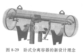 設計臥式分離容器時,在有限的分離空間中,為了使容器的分離能力增大,可以采用兩種方法:一是盡量延長容器進氣管的長度;二是盡最提高進氣管到分離液面的距離。例如設計成圖8-29,就是這種概念的一種設計模式。濕式回氣管不僅僅是到封頭就截止,而是將噴嘴直接延伸進入部分封頭,允許液體撞擊分離器的封頭位置而不飛濺,使液滴凝聚形成流體在封頭部沿壁往下流動,最后流入運行液面實現分離。噴嘴與水平濕式回氣管的連接形式,不是在產品目錄上看到的水平方式,而是形成一定的角度。