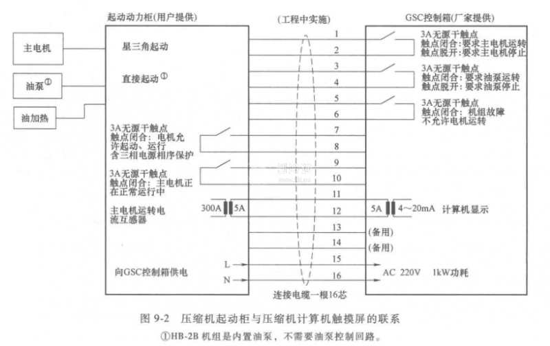 很多情況下壓縮機控制回路由生產廠家配套,與壓縮機的起動柜合并,主要的控制功能通常有兩方面:保護功能和運行功能。保護功能通常包括:排出壓力保護、冷凝壓力保護、油壓差保護、回氣壓力過低保護。壓縮機的運行功能通常包括:根據溫度或者回氣壓力的上卸載、能量調節或者壓縮機之間的聯動次序等;一些與壓縮機配套的功能如油泵運行、停機的潤滑油恒溫加熱等。這些功能都可以配套在控制柜上。比較有規模的壓縮機廠家通常把這部分制作成電路板,與壓縮機機組一起組成控制觸摸屏,由起動柜提供電源一起進行控制(圖9-2)。