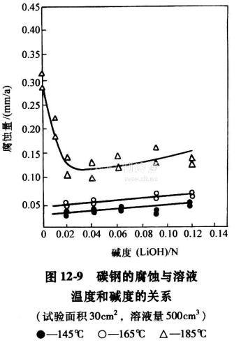 溴化鋰溶液對(duì)金屬材料的腐蝕,比氧化鈉(NaCI),氯化鈣(CaCI)?溶液等要小,但仍是一種較強(qiáng)的腐蝕介質(zhì),對(duì)制造溴化鋰吸收式冷水機(jī)組常用的碳鋼、純銅等金屬材料,具有較強(qiáng)的腐蝕性。按照日本的植村等人對(duì)溴化鋰溶液腐蝕研究的結(jié)果,在未添加緩蝕劑的質(zhì)量分?jǐn)?shù)為60%溴化鋰溶液中,碳鋼、純銅和鎳銅合金的腐蝕量與溶液的溫度和堿度的關(guān)系,如圖12-9和圖12-10所示。