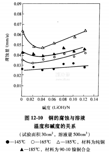 3)溶液的堿度。溴化鋰溶液的堿度一般可用pH值或氫氧化鋰(LiOH)的當(dāng)量濃度來表示。pH值小于7時,溶液呈酸性,對金屬材料的腐蝕十分嚴(yán)重。當(dāng)溴化鋰溶液的pH值處于8.0~10.2范圍內(nèi)時,即相應(yīng)的氫氧化鋰當(dāng)量濃度為0.007~0. 04N時,隨著堿度的增大,碳鋼和純銅的腐蝕率減小。但堿度也不宜過大,否則腐蝕反而加劇。試驗表明,溴化鋰溶液的堿度在pH值為9.5~10.3的范圍(相應(yīng)的氫氧化鋰當(dāng)量濃度為0.02~0.04N)內(nèi),對金屬材料的緩蝕較為有利。