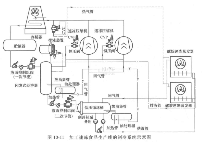 至于在氟利昂中潤滑油的分離問題,現在最普遍的方法是采用多級油分離器。據最新披露的消息,壓縮機上配置最多的分離級數可以達到五級。正在研究的無油壓縮機的產品,可以從根本上解決油的分離問題。即使有少量的潤滑油進人貯液器,使用二次節流(即采用閃發式經濟器)的方法,也是解決潤滑油進入低溫系統的一種很好的途徑。這是因為制冷劑在一次節流后進入閃發式經濟器,混合在制冷劑中的潤滑油由于在閃發式經濟器冷卻,相當部分的潤滑油由于重量輕,而基本上漂浮在經濟器液面的上層。給低壓循環桶供液的地方在經濟器的底部,因此幾乎沒有潤滑油再進入低壓低溫系統,這樣也就基本上解決了氟利昂系統潤滑油的回油問題。圖10-11是筆者設計與安裝的一個加工速凍食品生產線的制冷系統實例。