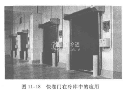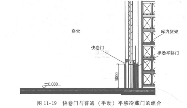 這種門在冷庫的使用通常是與普通(手動(dòng))平移冷藏門組合一起安裝(圖11-19)。在冷庫與穿堂的外面,安裝快卷門,而在這道門的里面,安裝的是普通冷藏門,特別適合配送型的冷庫使用。在白天配送頻繁,普通冷藏門開啟,冷庫門只有快卷門在配合開啟或者關(guān)閉,這樣是為了方便進(jìn)出貨,而到了下班完成配送后,再關(guān)閉普通冷藏門,可以增強(qiáng)冷庫門的保溫效果。