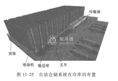 自動倉儲系統在冷庫的布置如圖11-25所示。在穿堂的叉車把貨物放在輸送帶上,輸送帶上的貨物首先進入傳輸廊,再從傳輸廊的門進入冷庫冷藏間。一般情況下,進傳輸廊的門與出傳輸廊的門相互錯開。目的是減少外界的空氣水分進入冷庫,避免造成傳輸設備或者輸送鏈條結冰,出現故障。傳輸廊使穿堂與冷藏間隔開,如果冷藏間的庫溫在-20℃,而穿堂的溫度為5~10℃,則傳輸廊的溫度在這兩者之間,即-5~0℃。傳輸廊相當于一個過渡間。