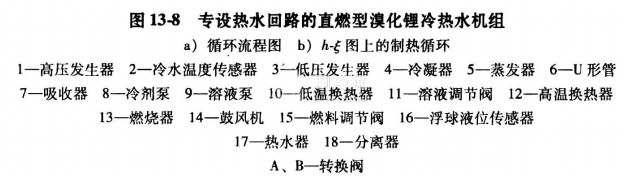 13-8為專設(shè)熱水回路的直燃型溴化鋰吸收式冷熱水機(jī)組及其制熱循環(huán)流程在圖上的表示。在制冷工況。轉(zhuǎn)換閥A、B關(guān)閉,熱水回路關(guān)閉,機(jī)組按稀溶液在低溫溶液換熱器之后分流的雙效溴化鋰吸收式機(jī)組的并聯(lián)循環(huán)流程工作。在采暖工況下,轉(zhuǎn)換閥A, B關(guān)閉,熱水回路開通,冷劑蒸汽自高壓發(fā)生器流入熱水器,并在其中冷凝;冷劑水自熱水器流回高壓發(fā)生器,并在其中稀釋濃溶液;熱水在熱水器傳熱管內(nèi)被加熱,并經(jīng)專設(shè)的熱水回路向機(jī)組外供熱。機(jī)組按如下制熱循環(huán)流程工作。