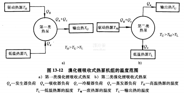 如圖13-12所示,溴化鋰吸收式熱泵機組可以按輸出熱的溫度與馭動熱源溫度的關系分為兩大類:①第一類溴化鋰吸收式熱泵,輸出熱的溫度低于驅動熱源的溫度 ,輸出熱的數量比驅動熱源提供的熱量多,又稱增熱型吸收式熱泵;②第二類溴化鋰吸收式熱泵,輸出熱的溫度幾高于驅動熱源的溫度,又稱升溫型吸收式熱泵機組。