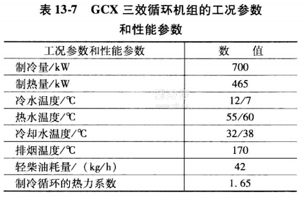 圖13-15是我國于1997年研制的三效溴化鋰吸收式機(jī)組的循環(huán)流程圖。該機(jī)組采取GCX三效循環(huán)流程。其結(jié)構(gòu)比較簡單,是在二效直燃型機(jī)組的基礎(chǔ)上增加一個發(fā)生器、一個溶液換熱器和煙氣換熱器。高壓發(fā)生器采用圓爐筒煙管式結(jié)構(gòu),高溫溶液換熱器采用板式結(jié)構(gòu),二者都按工作壓力0. 6MPa(表壓)設(shè)計(jì)。燃料的燃燒熱是機(jī)組的馭動熱源,并在高壓發(fā)生器中被直接利用。高壓和中壓發(fā)生器所產(chǎn)生冷劑蒸汽的冷凝熱,通過回?zé)岜恢袎汉偷蛪喊l(fā)生器用作加熱熱源。因此,在中壓和低壓發(fā)生器中,燃燒熱被間接地第二和第三次利用。機(jī)組的工況參數(shù)和性能參數(shù)見表13-7。