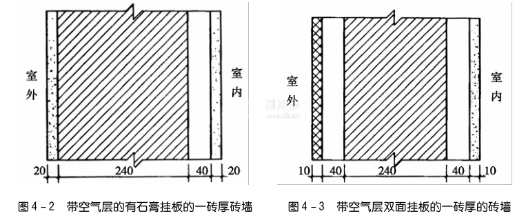 再如,在一磚厚的磚墻內表面上,不直接做傳統的抹灰,而是在現場施工,采用預制的石膏裝飾掛板,并形成一道空氣層。這一代替,可能成本還要比一磚半墻更低些,因為用工業規模生產的石膏板,代替落后的手工操作,又有了空氣層,使得此一磚厚墻的熱阻已超過一磚半厚的磚墻(圖4-2)。如果在磚墻的外表面上也采用石棉水泥掛板代替外抹灰,則可將此一磚厚的磚墻的熱阻變成相當于兩磚厚磚墻的熱阻(圖4-3)。這種有雙面空氣層外墻就具有優良的熱功能,既免于表面凝結水,也免于內部凝結水。在內表而層的背后的空氣層對保持內表而裝飾層的干噪是大為有益的。