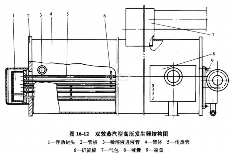 如圖16-12所示,雙效蒸汽型高壓發(fā)生器通常為一個(gè)單獨(dú)的筒體。主要由筒體、傳熱管、氣包(含擋液裝置)、液囊、浮動(dòng)封頭、端蓋、管板及折流板等組成。