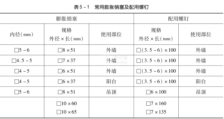 膨脹螺絲的直徑為5~6毫米,錨固深度≥6倍膨脹螺絲的直徑。空心磚或空心混凝土砌塊墻,宜采用德國(guó)托克斯萬(wàn)能銷寨,螺釘長(zhǎng)度等于保溫板厚度與銷塞長(zhǎng)度之和另加3~5毫米;螺釘直徑為4~5毫米。膨脹銷寨與配用螺釘見(jiàn)表5-1,也可單獨(dú)采用在墻內(nèi)預(yù)埋鋼筋來(lái)固定該夾芯保溫板(不再用W壓片),鋼筋直徑為6毫米,預(yù)埋筋間距500姍,且呈梅花形設(shè)置,錨固長(zhǎng)度應(yīng)大于180毫米。預(yù)埋鋼筋伸出主體外墻部分要進(jìn)行有效的防腐處理。