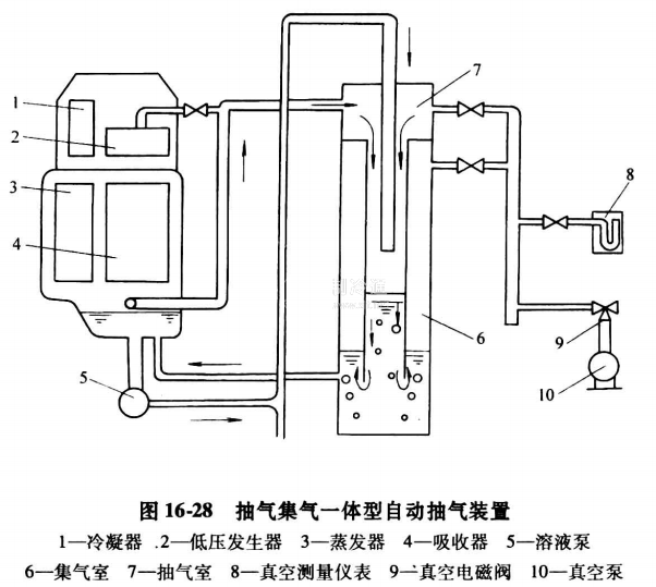 抽氣集氣一體型 圖16-28是一種抽氣集氣一體型自動抽氣裝置的示意圖。其工作原理與上述裝置相同,只是將分離器和集氣室設(shè)置在同一根大直徑的垂直管內(nèi)。這樣可以使結(jié)構(gòu)更加緊湊,只是集氣室6的儲存空間比較小。這種自動抽氣裝置的排氣,是通過真空泵10實現(xiàn)的。當集氣室6內(nèi)的壓力達到設(shè)定值后,真空測量儀表8發(fā)出信號,自動進行排氣操作,即使真空泵10啟動,真空電磁閥9開啟,進行排氣操作。