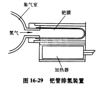把管排氫裝置如圖16-29所示,通常裝在自動抽氣裝置的集氣室上。鈀管排氫裝置在工作時,必須保持300℃左右的高溫。因此,需要利用加熱器進行加熱。除長期停機外,一般不切斷加熱器的電源。