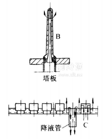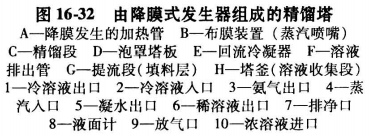 降膜式發生器 目前工程中較多采用蒸汽加熱的立式降膜發生器,其結構見圖16-32。它是立式管殼式結構的換熱器,處于整個精餾塔下部。上管板的每根降膜加熱管上,設有圖16-32所示的布膜器,上升的氨水混合蒸汽可從上端小孔噴出,而且提餾段下來的液體可順噴嘴外側流入管束內,并在管內壁呈膜狀流動,受管束外蒸汽加熱而不斷發生氨水混合蒸汽。液相質量分數變小而流至塔釜。加熱蒸汽在殼程流動,加熱溶液。