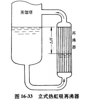 (1)立式熱虹吸式再沸器 圖16-33是一般立熱虹吸再沸器示意圖。由于再拂器內溶液被加熱而發,形成與精餾塔釜的液位差,推動溶液自然循環,提高了制冷設備的傳熱系數,節省換熱面積。