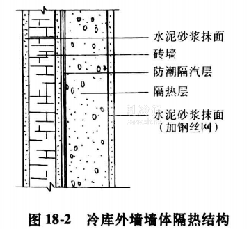 冷庫外墻由圍護墻體、防潮隔汽層、隔熱層和內保護層等組成(見圖18-2),圍護墻體有磚墻、預制混凝土墻和現澆鋼筋棍凝土墻等。一般采用熱惰性大、延遲時間長的磚外墻為多,其墻厚在240~370mm。為增強墻體穩定性,除設錨系梁外,可設不承載的磚垛。外墻面可用1:2水泥沙漿抹面。冷庫防潮隔汽層為油氈(一般為二氈三油),PVC塑料薄膜或噴涂的聚認階層。隔熱層可用塊狀、板狀或松散隔熱材料,如軟木、泡沫塑料(有塊狀、噴發和灌發三種型式)、礦A棉、稻殼等。冷庫內保護層多為插板或墉、20mm厚,1:2鋼絲網水泥砂漿抹而或彩鋼板等。