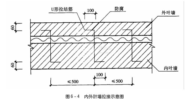 第十四,設置在內、外葉墻間的拉接鋼筋(圖6-4)應符合設計要求及下列規定:拉接鋼筋必須經除銹和防腐處理;拉接鋼筋的直徑宜為6毫米,形狀為L形;拉接鋼筋在墻面上應為梅花形設置,其豎向和水平向的間距不宜大于500毫米和1000毫米;拉接鋼筋的直鉤應水平擱置在內、外墻上,其擱置長度宜分別為180毫米和60毫米(不含直鉤長度)。內外葉墻間的拉接鋼筋不應與墻、柱拉接鋼筋擱置在同一條縫內。在磚墻上的所有拉接鋼筋均應埋置在砂漿層中。詳見圖6-4。