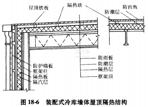 裝配式冷庫屋頂隔熱防潮層可有帶隔熱材料的瓦楞屋面板保護(hù),為了防雨、防太陽輻射熱的滲入,外墻上部可增設(shè)遮陽防雨瓦楞鐵皮或瓦楞石棉板等。裝配式冷庫的墻體和屋頂隔熱結(jié)構(gòu)見圖18-6。