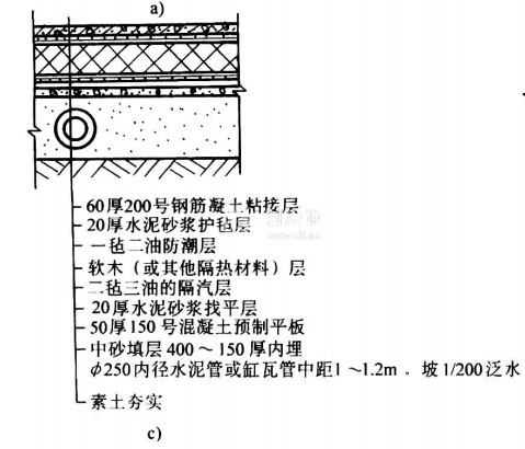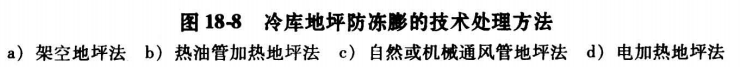 冷庫工程中防止地坪凍膨的方法有架空地坪法、埋設自然通風或機械通風管法、埋設加熱油管和電加熱地坪法等多種。圖18-8示出了幾種常用的冷庫地坪防凍膨的技術處理方法。