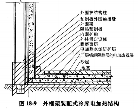 關于裝配式冷庫,由于其結構上的特點,除了通風道防凍外,可采用如圖18-9所示的電加熱地坪結構。冷庫地坪底部利用埋在混凝土層里的電熱絲加熱,所需功率為15~20W/m2,并通過溫度控制器控制,地坪隔熱層下維持6℃左右的恒溫。