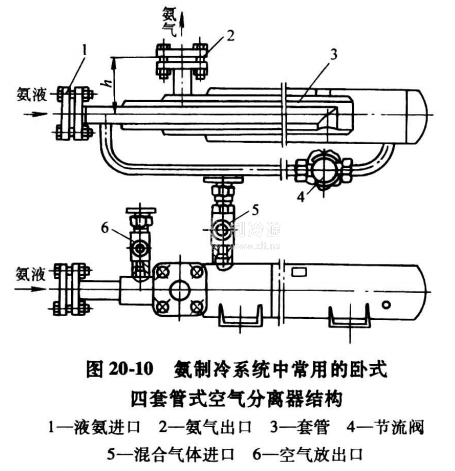 圖20-10所示為氨制冷系統中常用的臥式四套管式空氣分離器的結構。圖20-11為立式空氣分離器結構原理圖。