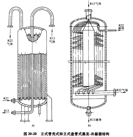 蒸發-冷凝器的基本結構型式有三種:立式殼管式、立式或臥式盤管式及套管式。圖20-20所示為立式殼管式和立式盤管式蒸發-冷凝器結構圖。一般高溫側制冷劑液體在直管內和盤管內汽化吸熱,低溫側氣體制冷劑則在管外殼內放熱冷凝。為了提高換熱效率,兩種制冷劑多為逆向流動,而高、低溫側之間的傳熱溫差,一般為5~10℃。蒸發-冷凝器的傳熱系數大約為460~520W/ (m2·K)。