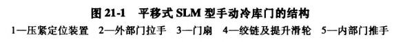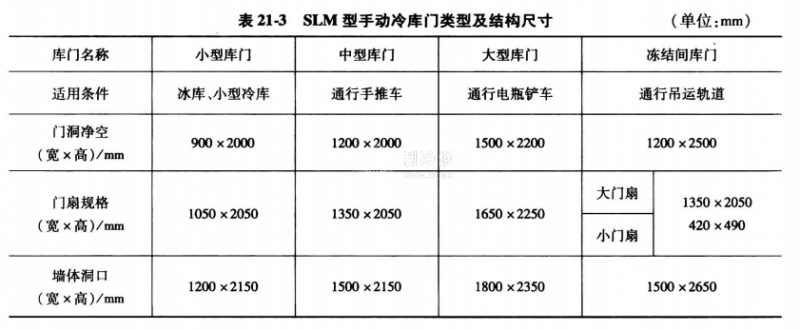 (1)外貼式平開手動冷庫門 該冷庫門以SLM型為代表,通常有左開和右開兩種。開啟角度有180°,135°和90°三種,裝有防凍電加熱器,并鑲嵌耐低溫的高強度e形橡膠密封條。平移式SLM型手動冷庫門的結構及尺寸見圖21-1和表21-3。