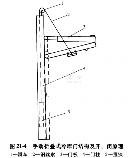 (1)手動折疊滑升式冷庫門 由上下兩扇門板用合頁連接而成,配上合適的平衡系統(tǒng),能自由開閉,并能自鎖。其基本結(jié)構(gòu)及工作原理見圖21-4。