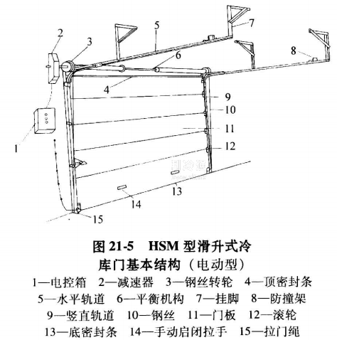 (2)手動弧形滑升式冷庫門 這種門適用于中小型冷庫,低溫配送中心或車庫等需要保溫、防塵的工作場所。較典型的滑升門有HSM型,其結(jié)構(gòu)如圖21-5所示,開啟可采用手動或電動機帶動。