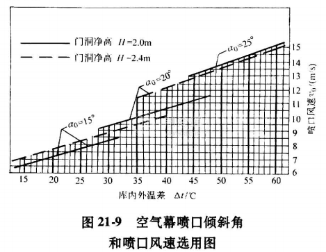 空氣幕噴口風(fēng)速、一般取平均風(fēng)速15m/s左右。在不同噴口傾斜角條件下,噴口最佳風(fēng)速可按圖21-9選取。