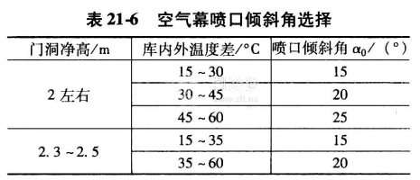 空氣幕的作用是減少冷庫(kù)內(nèi)、外熱濕交換,方便裝卸作業(yè)。空氣幕噴口厚度一定時(shí),其工作效率與冷庫(kù)的高度H、庫(kù)內(nèi)外溫差△t、噴射角度a0和噴口出風(fēng)速度v0有關(guān)。當(dāng)H和△t一定時(shí),空氣幕的效率即主要取決于a0和v0。空氣幕噴口角度a0見(jiàn)圖21-8。空氣幕噴口傾斜角選擇見(jiàn)表21-6。