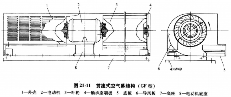 冷庫(kù)用空氣幕的基本型式有軸流式空氣幕和貫流式空氣幕兩種。貫流式應(yīng)用較廣泛。圖21-11所示為貫流式空氣幕結(jié)構(gòu)。