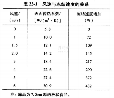 (1)鼓風式凍結用空氣作冷卻介質對食品進行凍結,是目前應用最廣泛的一種凍結方法。由于空氣的表面傳熱系數較小,在靜止空氣中凍結的速度很慢。故工業生產中已不大采用。增大風速,能使凍品表面傳熱系數增大,這樣凍結速度可加快。風速與凍結速度的關系見表23-1。