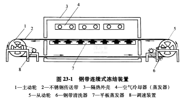 這種凍結裝置是在連續式隧道凍結裝置的基礎上發展起來的,如圖23-1所示。它由不銹鋼薄鋼帶、傳動輪(主動輪和從動輪)、調速裝置、空氣冷卻器(蒸發器)、隔熱外殼等部件組成。