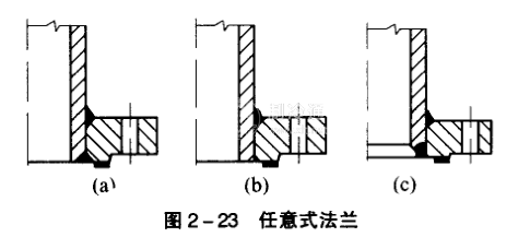 將法蘭環開好坡口并先鑲在筒體上,然后再焊在一起的法蘭稱為任意式法蘭,其結構類似整體法蘭中的平焊法蘭,但與筒體連接處未采用全焊透結構,故強度比后者差,常見的結構型式如圖2-23所示,只用于直徑較小的低壓容器上。