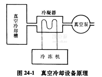 真空冷卻又名減壓冷卻,它的原理是根據(jù)水在不同的壓力下有不同的沸點。在正常的101. 3kPa壓力下,水在100℃沸騰;當壓力為0. 66kPa時,水在1℃就沸騰。在沸騰過程中,要吸收汽化潛熱,這個相變熱正好用于蔬菜的真空冷卻。為了利用這個原理組裝設備,必須設置冷卻食品的真空槽和可以抽掉真空槽內(nèi)空氣的裝置。圖24-1為真空冷卻設備原理圖。