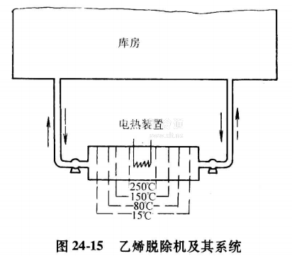 該設備的關鍵是催化劑(特殊的活性銀)的選擇,以及一個從外到里能形成15℃、 80℃、 150℃及250℃溫度梯度的變溫度場電熱裝置。它使乙烯脫除機的進、出口溫度不高于15℃,而中心氧化反應溫度達250℃以上。這樣既保證反應效果,又不給庫房增加過多的熱負荷,而且為進一步降低進入庫內氣體的溫度,乙烯脫除機的進、出氣管每隔幾分鐘切換一次,見圖24-15。