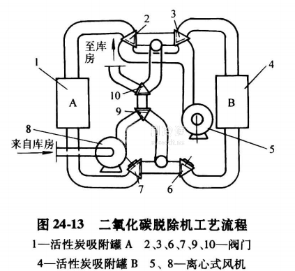 二氧化碳脫除機工藝流程見圖24-13。其工作過程如下:脫除運行時,離心式風機8抽出庫內二氧化碳含量較高的氣體,經閥門9, 6,進入吸附罐B,氣體中的二氧化碳被活性炭吸附,吸附后二氧化碳含量低的氣體,經閥門3, 10返回庫內,這樣就達到脫除目的。一般新鮮干凈的活性炭,經數分鐘吸附后,即達到飽和或平衡狀態。為了使活性炭重新獲得吸附二氧化碳的能力,必須進行再生。B罐進行再生時,A罐進行吸附;B罐吸附時,則A罐進行再生。再生運行時,離心式風機5把庫外新鮮空氣(二氧化碳含量低于0.5%)通過閥門2送入A罐,由于空氣中只含有微量的二氧化碳,被活性炭吸附的二氧化碳將釋放到空氣中,然后由閥門7排到大氣。經一段時間的脫附后,活性炭中只留下極微量的二氧化碳,重新獲得了二氧化碳吸附能力。