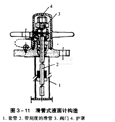 滑管式液面計(jì)(圖3-11)主要由套管、帶刻度的滑管、閥門和護(hù)罩等組成,一般用于液化石油氣汽車槽車、火車槽車和地下儲(chǔ)罐。測(cè)量液位時(shí),將帶有刻度的滑管拔出,當(dāng)有液態(tài)液化石油氣流出時(shí),即知液位高度。
