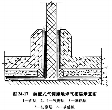 各類氣調庫地坪的做法基本相同。為了保證氣密性,地坪隔熱層上下除設置防潮隔汽層外,還要單獨設置氣密層。常用的做法是連續鋪設0.1mm厚PVC塑料薄膜。該層薄膜應完好無損,鋪設平整,不允許出現皺褶和起膨,搭接寬度不得少于100mm,并保證搭接處的密封質量。隔熱層上方的氣密層應做水泥砂漿保護層。在墻體與地坪的交接處,應將地坪的氣密層,在地板的墻角處沿墻板向上延伸一定的高度,與端體的氣密層搭接好,見圖24-17。地坪墻角處的氣密不易處理好,可待地坪做好后,用瀝青膏之類的軟質密封材料灌縫。