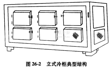 新型冷柜多把機組置在柜體上部,并采用全封閉式或半封閉式制冷壓縮機,其柜內(nèi)冷卻方式,吹風(fēng)冷卻(無霜型)、盤管冷卻兼而有之。上置機組式冷柜能更充分利用柜內(nèi)空間,有效容積較大。六門以上的封閉式冷柜,可作為組裝式冷庫使用,采用分體式機組,柜內(nèi)可采用不同分割形成多個小冷間,通過制冷管系的不同組合,控制實現(xiàn)冷藏、冷凍或冷藏冷凍。立式冷柜典型結(jié)構(gòu)如圖26-2所示。