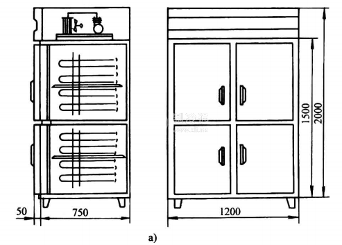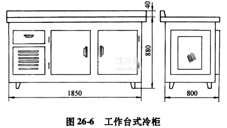 為了滿足餐飲業(yè)和賓館、酒店的特殊要求,一種新型工作臺式冷柜已進入市場,其基本結(jié)構(gòu)如圖26-6所示。臺式冷柜具有結(jié)構(gòu)強度較大且隔熱性能良好的臺面,配以自動開啟復(fù)位的柜門,全封閉風(fēng)冷式制冷壓縮機組,直接盤管冷卻。該冷柜溫度調(diào)節(jié)范圍大,-5~-18℃任意調(diào)節(jié)。典型產(chǎn)品如上海海鷗電器總廠生產(chǎn)的臺式冷柜,有TORO. 3 L 、TGBO. 5 L 、TGBO. 6L、TMO. 3和TMO.4L等型號。型號中T、B、L分別表示冷柜結(jié)構(gòu)為臺式、封閉式和立式;G、M則表示柜內(nèi)溫度為高溫(-2~5℃),中溫(-12 ~2℃);數(shù)字0.3、 0.4、 0.6等表示冷柜的公稱容積。