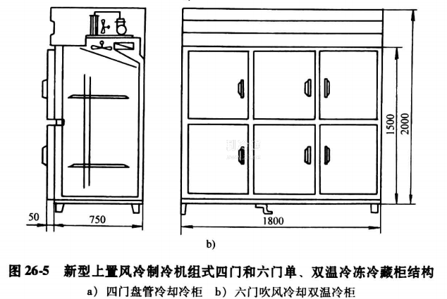 圖26-5所示為新型上置風(fēng)冷制冷機組式四門和六門單、雙溫冷凍冷藏柜結(jié)構(gòu)。冷柜可分兩個冷間,實現(xiàn)雙溫自動控制,冷藏室溫度可調(diào)0~5℃。冷凍室可調(diào)-12~-15℃,最低-18℃。全封閉R22制冷壓縮機噪聲低,工作性能穩(wěn)定、可靠。冷柜內(nèi)外壁板及門內(nèi)外包板多采用不銹鋼板,也可采用塑鋼板制作。壁板隔熱結(jié)構(gòu)為聚氨酯整體發(fā)泡,隔熱性能良好。